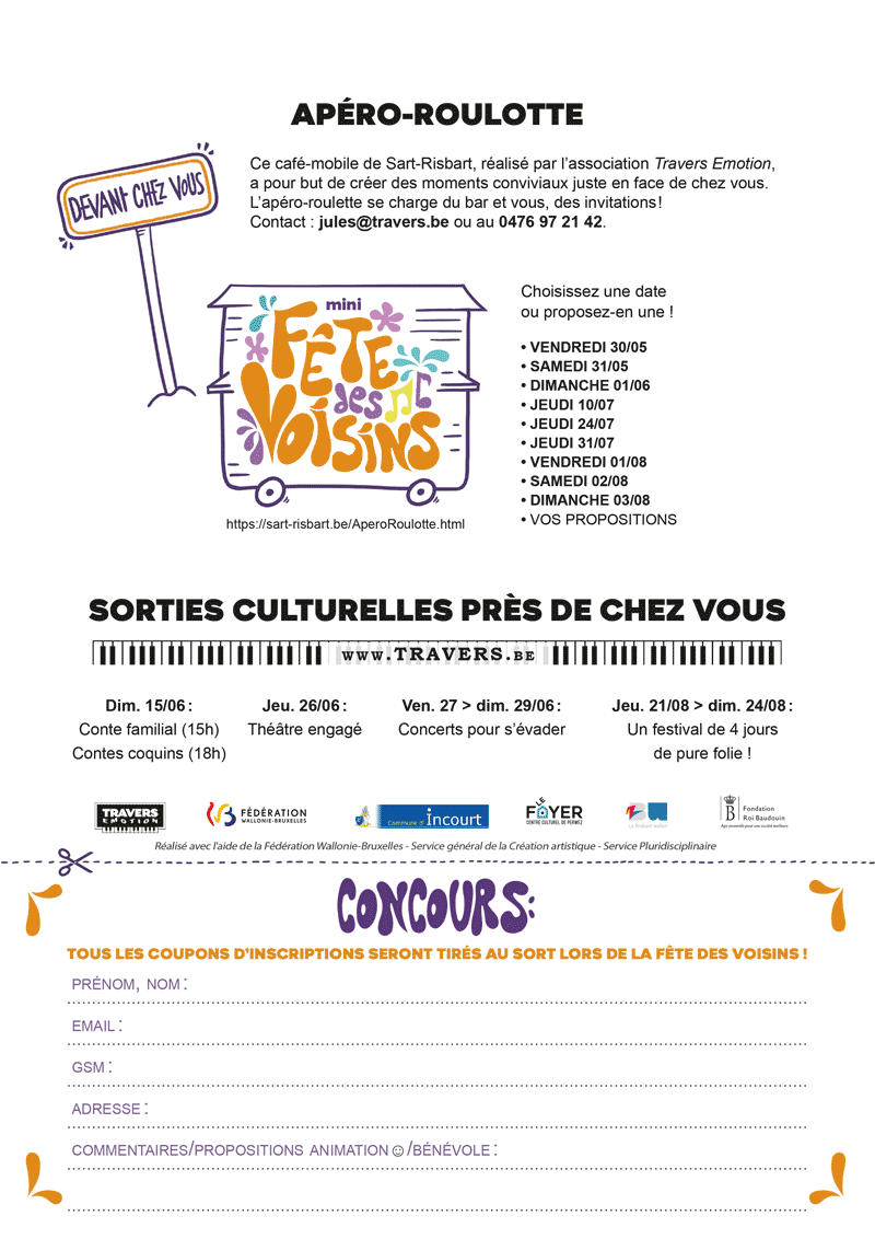 Travers Emotion est une association qui oeuvre pour favoriser la création de liens de proximités, la solidarité, l’émerveillement, le bien-être... par l’organisation de rencontres socio-culturelles et par la programmation d’événements culturels mensuels et annuels tels que le festival "Les Sentiers de Sart-Risbart".
